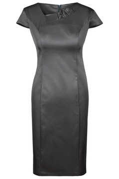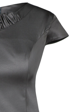 Sukienka ołówkowa. Dekolt przodu asymetryczny, podkreślony marszczeniem. Biust wymodelowany cięciami francuskimi. Rękawek krótki, zakrywa górną część ramion. Tkanina gładka, lekko elastyczna, bardzo wytrzymała. Suwak kryty z tyłu. Na dole rozporek pozwalający na swobodne chodzenie. Bez podszewki. Sukienka idealna na co dzień, do pracy biurowej lub na oficjalne spotkania. Do sukienki idealnie pasuje żakiet o symbolu: FZA633. Został on uszyty z tej samej tkaniny.