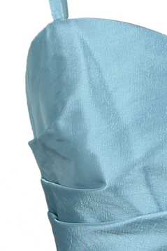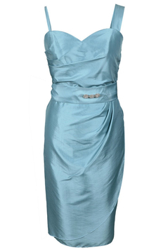 Sukienka wizytowa. W zestawie bolerko z krótkim rękawem. Sukienka jest asymetryczna, prawe ramiączko wąskie, natomiast lewe szerokie. Dekolt sercowe karo. Na biuście z prawej strony znajdują się 3 średniej wielkości zakładki. Odcięta w pasie. Podkreślona szerokim paskiem z ozdobnymi guzikami. Na dole wierzchnia warstwa asymetryczna, po lewej stronie ozdobiona zakładkami. Sukienka została uszyta z tafty. Jest to tkanina bardzo elegancka, ale stabilna. Porównując swoje wymiary z wymiarami sukienki, należy uwzględnić kilka centymetrów luzu. Z tyłu suwak kryty, na dole pęknięcie umożliwiające swobodne chodzenie. Sukienka idealna dla kobiet, lubiących wyglądać modnie i elegancko. Można ją założyć na wesele, komunie i wiele innych okazji.