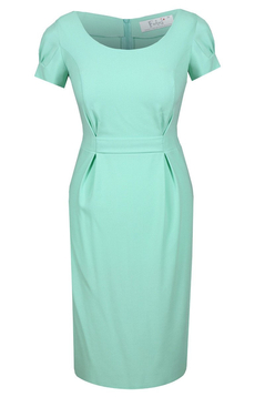 Klasyczna, dopasowana sukienka. Dekolt okrągły. Rękaw krótki, z ozdobnym marszczeniem. Ocięcie w talii, podkreślone paskiem. Na przodzie cięcia francuskie, zaakcentowane w pasie drobnymi kontrafałdami. Z tyłu suwak kryty, zaszewki taliowe, oraz na dole rozporek zakładany. Sukienka została uszyta z tkaniny elastycznej. Miła w dotyku, nie ulega mechaceniu i nadmiernemu gnieceniu. Bez podszewki. Sukienka powstała z myślą o kobietach dojrzałych, lubiących wyglądać modnie i elegancko przy każdej okazji.