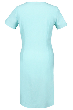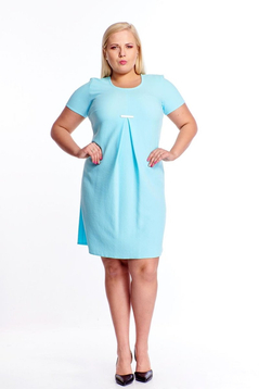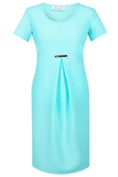 Lekko rozkloszowana, luźna sukienka, pozwoli zatuszować niedoskonałości sylwetki. Uszyta z tkaniny nie ulegającej gnieceniu i mechaceniu. Dekolt okrągły. Na środku przodu jest głęboka kontrafałda, zaakcentowana złotą ozdobą z logo firmy. Rękaw krótki. Bez podszewki. Bez zapięcia. Sukienkę polecamy na sezon wiosenno - letni, kobietom w różnym wieku, na wszelkie spotkania rodzinne i służbowe.