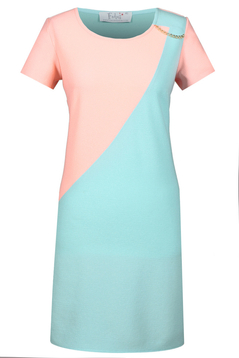 Sukienka w kształcie trapezu. Dopasowana jedynie w biuście, natomiast w pasie i biodrach luźna. Dekolt okrągły. Rękaw krótki. Przód oryginalnie zaprojektowany, z boku przy ramieniu ozdobny łańcuszek. Sukienka została uszyta z najwyższej jakości tkaniny. Jest bardzo przyjemna w dotyku. Nie ulega mechaceniu. Bez podszewki. Sukienka powstała z myślą o dziewczynach i kobietach w różnym wieku. Przeznaczona do noszenia na co dzień. Jeśli chcesz czuć się komfortowo i wyglądać elegancko, to ta sukienka jest właśnie dla Ciebie.