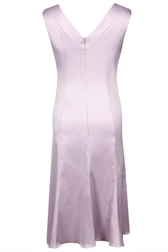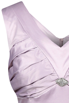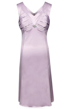 Sukienka o linii trapezu. Dekolt serek. Ramiączka szerokie - 9 cm. Bez rękawa. Na biuście ozdobne marszczenia. Na środku przodu broszka. Pod biustem odcięcie, poniżej cięcia pionowe. Suwak kryty z tyłu. Sukienka uszyta z satyny. Jest to tkanina z delikatnym połyskiem, elastyczna, nie ulega nadmiernemu gnieceniu i mechaceniu. Jest podszewka. Sukienka idealna na wesela, komunie i wiele innych okazji.