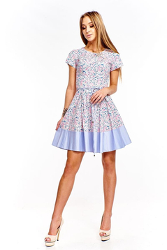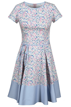 Rozkloszowana sukienka z krótkim rękawem. Dekolt okrągły, wykończony lamówką. Cięcia francuskie z przodu i z tyłu. Od talii z przodu i z tyłu - dwie kontrafałdy. Pas na dole uszyty został z gładkiego materiału – tego samego co lamówka przy dekolcie. W zestawie, wąski, zawiązywany pasek. Z tyłu na środku kryty zamek. Sukienka z naturalnego surowca, idealna na wiosnę i lato. Uniwersalna, odpowiednia na różne imprezy okolicznościowe, spotkania rodzinne i biznesowe, na co dzień. Urocza i dodająca wdzięku, sprawia że każda kobieta wygląda w niej młodo i atrakcyjnie.