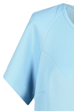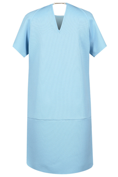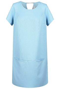 Sukienka z krótkim rękawem, z miękkiej tkaniny. Luźna. Dekolt półokrągły, wykończony lamówką.  Rękaw reglanowy, składający się z dwóch części. Z przodu w biuście dwie zaszewki modelujące. Na dole cięcie. W miejscu cięcia 2 kieszenie. Na plecach, przy dekolcie pęknięcie, na górze połączone złotą ozdobą. Sukienka uniwersalna: na wesela, komunie i inne imprezy okolicznościowe, jak również na skromniejsze spotkania rodzinne czy biznesowe. Wygodna, nie krępująca ruchów. Prosty krój sprawia, że kobieta w każdym wieku i każdym rozmiarze będzie w niej wyglądać modnie i czuć się atrakcyjnie.