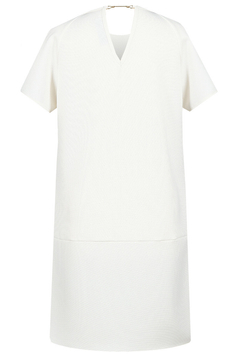 Sukienka z krótkim rękawem, z miękkiej tkaniny. Luźna. Dekolt półokrągły, wykończony lamówką. Rękaw reglanowy, składający się z dwóch części. Z przodu w biuście dwie zaszewki modelujące. Na dole cięcie. W miejscu cięcia 2 kieszenie. Na plecach, przy dekolcie pęknięcie, na górze połączone złotą ozdobą. Sukienka uniwersalna: na wesela, komunie i inne imprezy okolicznościowe, jak również na skromniejsze spotkania rodzinne czy biznesowe. Wygodna, nie krępująca ruchów. Prosty krój sprawia, że kobieta w każdym wieku i każdym rozmiarze będzie w niej wyglądać modnie i czuć się atrakcyjnie.