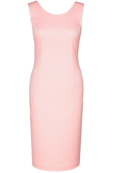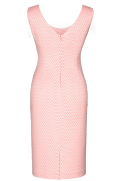 Klasyczna, dopasowana, zwężająca się dołem, ołówkowa sukienka. Na przodzie cięcia francuskie. Z tyłu zaszewki taliowe, oraz rozporek pozwalający swobodnie stawiać kroki. Dekolt na plecach wycięty w kształcie serka. Zapinana na suwak kryty z tyłu, ułatwiający zakładanie. Uszyta z elastycznego, niezwykle szykownego żakardu, który zapewni wygodę podczas użytkowania. Bez podszewki. Sukienka codzienna, można ją włożyć do pracy, do kawiarni, na służbowe spotkanie, ale połączona z bogatą biżuterią doskonale sprawdzi się na uroczystych spotkaniach, np. na weselu.