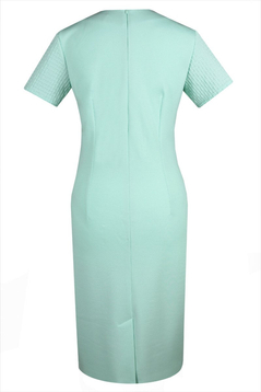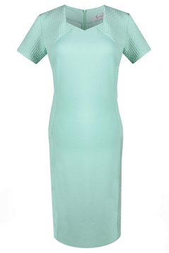 Sukienka dopasowana, ołówkowa. Dekolt o oryginalnym kształcie z błyszczącymi ozdobami wyglądającymi jak naszyjnik . Cięcia pionowe wyszczuplają sylwetkę. Materiał główny to średniej grubości dzianina, bardzo przyjemna w dotyku. Rękawy i kontrastowe wstawki zostały uszyte z żakardu, z widoczną strukturą. Jest to bardzo wysokiej jakości tkanina. Bez podszewki. Z tyłu suwak kryty, na dole rozporek zakładany. Sukienkę można nosić na co dzień, ale po odpowiedniej stylizacji można w niej wystąpić nawet na uroczystych spotkaniach.