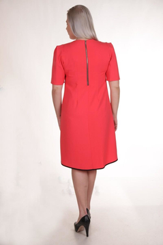 Codzienna sukienka. Fason trapez. Dopasowana jest jedynie w biuście, w pasie i w biodrach luźna. Dekolt okrągły. Poniżej ozdobna czarna kokardka z firmową przywieszką. Rękaw sięgający do łokcia, z oryginalną zakładką przy ramieniu. Zapinana z tyłu na ozdobny metalowy suwak.  Tył prosty. Jest podszewka. Dół wykończony czarną lamówką. Sukienkę polecamy kobietom w każdym wieku, idealna na co dzień do pracy, jak również na prywatne spotkania. Sukienkę powinny nosić kobiety o wąskich ramionach i szerokich biodrach.