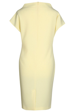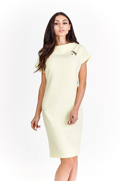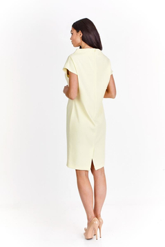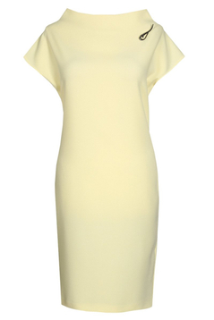 Ołówkowa sukienka, dopasowana jest w biodrach, natomiast w pasie oraz biuście luźna. Rękaw krótki, - kimono. Dekolt łódka, odstający na ramionach, tworzy kształt komina. Przy szyi znajduje się srebrna, dopinana broszka. Sukienka uszyta została z bardzo dobrej gatunkowo tkaniny. Bez podszewki. Z tyłu suwak kryty oraz rozporek umożliwiający swobodne chodzenie. Sukienkę polecamy kobietom w każdym wieku na co dzień, ale przy odpowiednim dobraniu dodatków sprawdzi się również w wyjściowej stylizacji. Jeśli chcesz wyglądać pięknie i czuć się komfortowo, to ta sukienka jest waśnienie dla Ciebie.