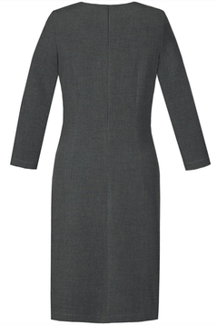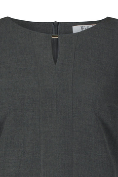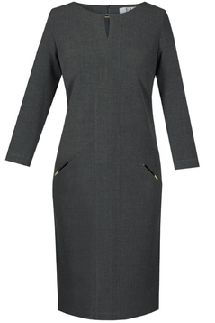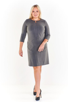 Klasyczna, prosta sukienka. Dekolt okrągły, podkreślony metalową ozdobą, poniżej rozcięcie. Na biuście poziome zaszewki, przebiegające do boku. Na środku przodu znajdują się dwa pionowe pasy o szerokości 4 cm każdy. W okolicy bioder skośne kieszenie zaakcentowane blaszkami. Sukienka została uszyta z przyjemnej w dotyku, delikatnie elastycznej tkaniny. Materiał nie ulega mechaceniu. Z tyłu suwak kryty oraz zaszewki modelujące talię. Sukienka została zaprojektowana z myślą o kobietach dojrzałych. Sukienka jest bardzo funkcjonalna. Można ją włożyć do pracy biurowej, na spotkania rodzinne jak i służbowe, oraz na wiele innych okazji.