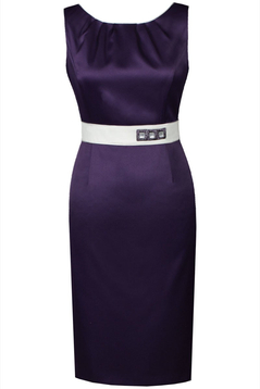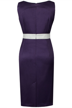 Dopasowana, ołówkowa sukienka. Uszyta została z bardzo eleganckiej, delikatnie połyskującej tkaniny. Wykończona podszewką. Bez rękawów. Dekolt okrągły z zakładkami, zaakcentowany wypustką. Cięcia francuskie. W talii znajduje się pasek w kontrastowym kolorze, podkreślony wypustkami takimi samymi, jak przy dekolcie oraz ozdobną aplikacją po lewej stronie przodu. Na środku z tyłu kryty zamek, na dole rozcięcie, po bokach zaszewki modelujące. Sukienka idealna na wesele, Komunię lub inną imprezę okolicznościową. Prosty krój sukienki z ciekawym dekoltem sprawi, że każda dojrzała kobieta będzie w niej czuć się dobrze oraz wyglądać atrakcyjnie.