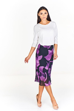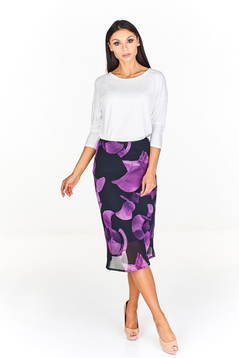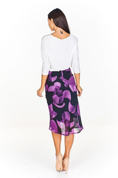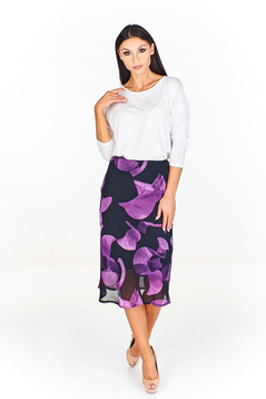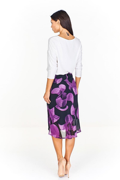 Spódnica o linii trapezu, dopasowana w pasie, natomiast niżej poszerzana. Długość midi, kolano jest zakryte. Doskonale prezentuje się na figurze. Uszyta z delikatnej tkaniny - zorżety. Jest podszewka. Skład surowcowy 100% poliester. Spódnica sprawdzi się w wielu stylizacjach. W połączeniu z prostym topem, tworzy idealny zestaw na co dzień, na spacer, na zakupy. Spódnica powstała z myślą o kobietach w różnym wieku ceniącym dobry wygląd i wygodę podczas użytkowania.