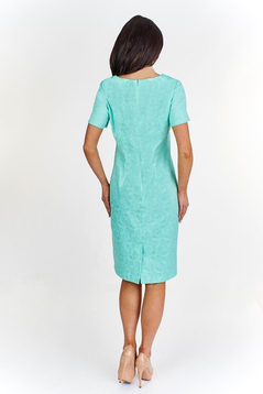 Klasyczna, dopasowana, zwężająca się dołem, ołówkowa sukienka. Dekolt szpiczasty. Rękaw krótki. Na przodzie cięcia francuskie z ozdobnym kółeczkiem, przez które przechodzą korale. Z tyłu zaszewki oraz rozporek pozwalający swobodnie stawiać kroki. Zapinana na suwak kryty z tyłu, ułatwiający zakładanie. Uszyta z elastycznego, niezwykle szykownego żakardu, który jest wygodny podczas użytkowania. Bez podszewki. Dół wykończony ściegiem krytym. Sukienka codzienna, można ją włożyć do pracy, do kawiarni, na  służbowe spotkanie, ale połączona z odpowiednimi dodatkami  doskonale sprawdzi się na uroczystościach takich jak wesele, studniówka, sylwester.