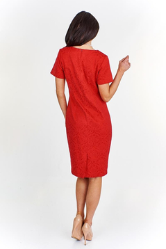 Klasyczna, dopasowana, zwężająca się dołem, ołówkowa sukienka. Dekolt szpiczasty. Rękaw krótki. Na przodzie cięcia francuskie z ozdobnym kółeczkiem, przez które przechodzą korale. Z tyłu zaszewki oraz rozporek pozwalający swobodnie stawiać kroki. Zapinana na suwak kryty z tyłu, ułatwiający zakładanie. Uszyta z elastycznego, niezwykle szykownego żakardu, który jest wygodny podczas użytkowania. Bez podszewki. Dół wykończony ściegiem krytym. Sukienka codzienna, można ją włożyć do pracy, do kawiarni, na służbowe spotkanie, ale połączona z odpowiednimi dodatkami doskonale sprawdzi się na uroczystościach takich jak wesele, studniówka, sylwester.
