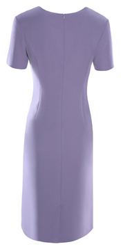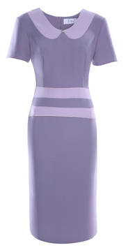 Prosta elegancka sukienka uszyta z najwyższej jakości lekko rozciągliwej tkaniny. W pastelowych  zestawach kolorystycznych do wyboru. Delikatny okrągły dekolt imitujący kołnierz ze srebrnym guziczkiem w formie dekoracji. Rękaw krótki. Cięcie francuskie plus odcięcie w talii sprawiają, że sylwetka wygląda na szczuplejszą i smuklejszą. Z tyłu suwak i dyskretny rozporek. Materiał jest miły w dotyku i nie ulega gnieceniu. Sukienka idealna dla dojrzałych kobiet. Idealnie kryje mankamenty figury. W zależności od dodatków sprawdzi się zarówno w dzień jak i na wieczorne wyjścia.