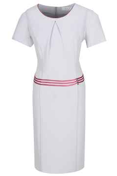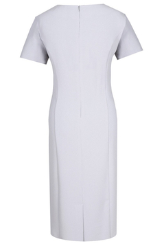 Prosta, dopasowana sukienka. Dekolt okrągły, podkreślony wypustką. Na środku przodu zakładki. Rękaw krótki. Zarówno z przodu jak i z tyłu od pach do samego dołu przebiegają cięcia francuskie. Optycznie wyszczuplają sylwetkę. W pasie zostały naszyte 3 tasiemki, na lewym boku znajdują się 3 ozdobne guziczki. Sukienka została uszyta z miłej w dotyku, delikatnie elastycznej tkaniny. Bez podszewki. Materiał użyty do produkcji nie ulega gnieceniu i mechaceniu. Z tyłu suwak kryty, na dole rozporek ułatwiający swobodne chodzenie. Sukienka została zaprojektowana z myślą o kobietach dojrzałych, lubiących wyglądać elegancko przy każdej okazji.