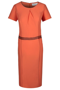 Prosta, dopasowana sukienka. Dekolt okrągły, podkreślony wypustką. Na środku przodu zakładki. Rękaw krótki. Zarówno z przodu jak i z tyłu od pach do samego dołu przebiegają cięcia francuskie. Optycznie wyszczuplają sylwetkę. W pasie zostały naszyte 3 tasiemki, na lewym boku znajdują się 3 ozdobne guziczki. Sukienka została uszyta z miłej w dotyku, delikatnie elastycznej tkaniny. Bez podszewki. Materiał użyty do produkcji nie ulega gnieceniu i mechaceniu. Z tyłu suwak kryty, na dole rozporek ułatwiający swobodne chodzenie. Sukienka została zaprojektowana z myślą o kobietach dojrzałych, lubiących wyglądać elegancko przy każdej okazji.