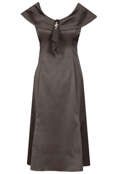 Sukienka wizytowa. Dekolt okrągły wykończony bardzo ozdobnym, opadającym na ramiona, szerokim kołnierzem. Na środku przodu, na kołnierzu znajdują się zakładki. Cięcia pionowe, dodają sylwetce lekkości. Dół poszerzany. Suwak kryty z tyłu. Jest podszewka, ale kończy się w okolicy pasa. Sukienka została uszyta z tkaniny lekko elastycznej, z delikatnym połyskiem. Sukienkę polecamy kobietom dojrzałym, na ważne uroczystości, np. wesela, komunie i wiele innych okazji.