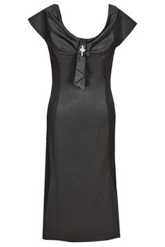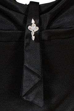 Sukienka wizytowa. Dekolt okrągły wykończony bardzo ozdobnym, opadającym na ramiona, szerokim kołnierzem. Na środku przodu, na kołnierzu znajdują się zakładki. Cięcia pionowe, dodają sylwetce lekkości. Dół poszerzany. Suwak kryty z tyłu. Jest podszewka, ale kończy się w okolicy pasa. Sukienka została uszyta z tkaniny lekko elastycznej, z delikatnym połyskiem. Sukienkę polecamy kobietom dojrzałym, na ważne uroczystości, np. wesela, komunie i wiele innych okazji.