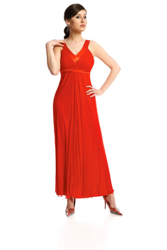 Długa, zwiewna, rozkloszowana sukienka. Połączenie szyfonu z satyną. Na karczku z przodu efektowne, delikatne plisowanie nieco dodające biustowi objętości. Dekolt przodu w kształcie serka, wysmuklający szyję. Z tyłu – w kształcie karo. Szerokie ramiączka. Odcięcie pod biustem podkreślone wąskim paskiem. Zapinana z tyłu na kryty suwak ułatwiający zakładanie. Sukienka maxi, doskonała na wesele, studniówkę i każdy inny uroczysty bal.