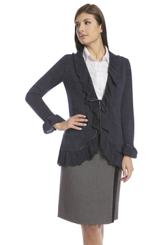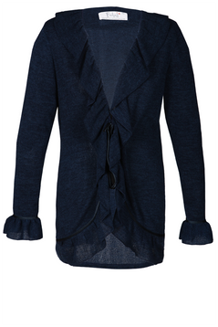 Uniwersalne wdzianko, doskonałe na chłodniejsze jesienne dni. Przód i doły rękawów wykończone delikatnie marszczoną falbanką. Na przodzie w pasie są lamówki, które spełniają funkcję wiązania. Do produkcji wdzianka użyto sweterkowej dzianiny. Jest ona miła w dotyku, nie gniecie się. Doskonała do pracy, na spacer, na rower i wiele innych formalnych i nieformalnych spotkań.