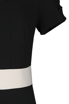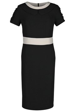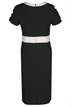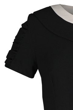 Klasyczna, dopasowana, ołówkowa sukienka. Dekolt okrągły, podkreślony kontrastową plisą oraz kołnierzykiem. Rękaw krótki, z marszczeniem. Na przodzie zaszewki piersiowe oraz taliowe. Suwak kryty z tyłu, rozporek na dole ułatwiający swobodne stawianie kroków. Bez podszewki. Sukienka została uszyta z tkaniny delikatnie rozciągliwej. Nie ulega gnieceniu i mechaceniu, jest przyjemna w dotyku. Sukienkę polecamy na co dzień do pracy biurowej, ale nie tylko. Przybrana odpowiednią biżuterią sprawdzi się również na weselu, i wielu innych uroczystych spotkaniach.