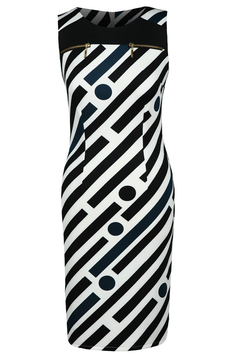 Szykuje się jakaś specjalna okazja, spotkanie rodzinne, wypad na miasto z przyjaciółką? Sukienka o ołówkowym kroju, elastyczna i miła w dotyku dzianina. Bardzo wygodna i komfortowa. Materiał wzorzysty, przy czym nie wymaga dodatkowych zdobień jej geometryczne wzory dodają oryginalności i kolorytu. Wzbogacona o wstawki z ekoskóry i metalowe suwaki jako element ozdobny. Z powodzeniem możesz do niej nosić żakiet tworząc stylizację do pracy a z ramoneską wykreować wzór codzienności. Świetna w połączeniu z jednokolorowymi dodatkami.