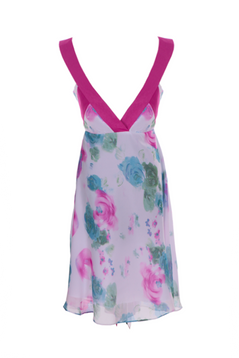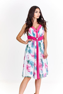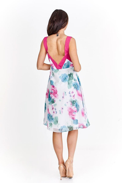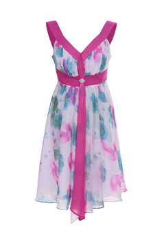 Zwiewna, delikatna, sukienka z drukowanego, kwiecistego szyfonu. Dół marszczony i rozkloszowany, doskonale tuszuje biodra dodając sylwetce lekkości. Plecy częściowo odkryte, ze szpiczastym dekoltem. Na biuście marszczenia, podkreślające kobiece wdzięki. Na środku przodu ozdoba z cyrkonii, pod którą znajdują się 2 szarfy – gładka oraz wzorzysta. Tkanina bardzo miła w dotyku, nie ulega nadmiernemu gnieceniu i mechaceniu. Suwak kryty z boku. Jest podszewka. Sukienka idealna na lato, dedykowana głównie młodym kobietom, chcącym wyglądać elegancko i zjawiskowo.