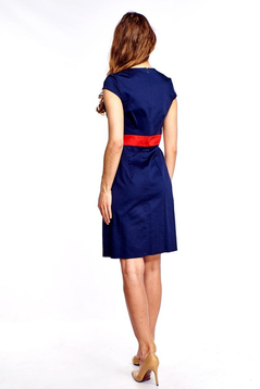Szykuje się jakaś specjalna okazja, obiad w gronie rodziny a może wypad na miasto z przyjaciółmi? Sukienka dla Pań które cenią sobie oryginalność i nietuzinkowość. Granat, czerwień, czerń i biel to charakterystyczne zestawienie kolorów dla stylu marine. Tak ubrana możesz iść na spotkanie ze znajomymi, do pracy lub na randkę z ukochanym. Sukienka uszyta z gładkiej tkaniny z połączenia dwóch zestawów kolorystycznych. Odcięta w pasie pięknie podkreśli twoja sylwetkę. Dekolt reprezentatywny, stylowe wykończenie. Z powodzeniem możesz do niej nosić marynarki. W tej sukience będziesz wyglądała ponadczasowo, modnie na sezon wiosna/lato.