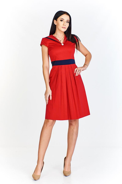 Szykuje się jakaś specjalna okazja, obiad w gronie rodziny a może wypad na miasto z przyjaciółmi? Sukienka dla Pań które cenią sobie oryginalność i nietuzinkowość. Granat, czerwień, czerń i biel to charakterystyczne zestawienie kolorów dla stylu marine. Tak ubrana możesz iść na spotkanie ze znajomymi, do pracy lub na randkę z ukochanym. Sukienka uszyta z gładkiej tkaniny z połączenia  dwóch zestawów kolorystycznych. Odcięta w pasie pięknie podkreśli twoja sylwetkę. Dekolt reprezentatywny, stylowe wykończenie. Z powodzeniem możesz do niej nosić marynarki. W tej sukience będziesz wyglądała ponadczasowo, modnie na sezon wiosna/lato.