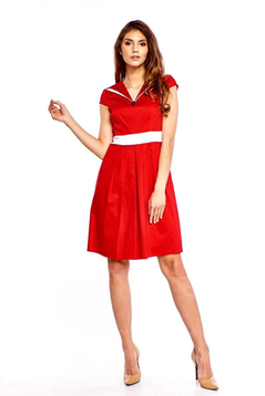 Szykuje się jakaś specjalna okazja, obiad w gronie rodziny a może wypad na miasto z przyjaciółmi? Sukienka dla Pań które cenią sobie oryginalność i nietuzinkowość. Granat, czerwień, czerń i biel to charakterystyczne zestawienie kolorów dla stylu marine. Tak ubrana możesz iść na spotkanie ze znajomymi, do pracy lub na randkę z ukochanym. Sukienka uszyta z gładkiej tkaniny z połączenia dwóch zestawów kolorystycznych. Odcięta w pasie pięknie podkreśli twoja sylwetkę. Dekolt reprezentatywny, stylowe wykończenie. Z powodzeniem możesz do niej nosić marynarki. W tej sukience będziesz wyglądała ponadczasowo, modnie na sezon wiosna/lato.