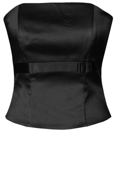 Gorset z fiszbinami wiązany z tyłu. Z przodu gorset jest delikatnie wydłużony , a górna część lekko zabudowana. Talia jest podkreślona taśmą satynową z fantazyjną kokardką. Gorsetem podkreślisz piękne ramiona i uwydatnisz biust, wiązaniem z tyłu dobrze go dopasujesz. Materiał- połyskująca satyna. Dopasowana góra, podkreślona talia to klasa i styl.