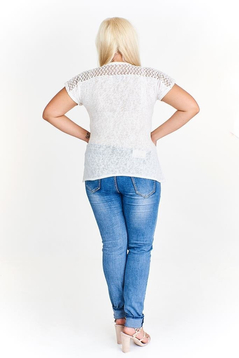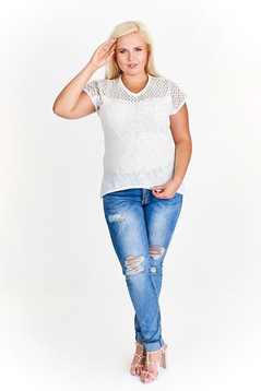 Luźna bluzka, uszyta z dzianiny sweterkowej w połączeniu z bawełnianą koronką. Dekolt szpiczasty wykończony wypustką. Rękaw kimono. Na przodzie z lewej strony naszyta kieszonka. Boki nieco wydłużone, sprawiają że sylwetka wydaje się być smuklejsza. Bluzka idealna na wiosnę oraz chłodniejsze dni latem. W połączeniu z wąskimi spodniami wygląda zachwycająco.