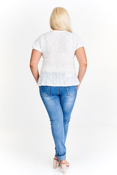 Bluzka z baskinką, uszyta została z dzianiny swetrowej, bardzo rozciągliwej. Z przodu cięcia francuskie. Na środku wstawka w postaci cieniowanej koronki ozdobiona perełkami. Rękaw krótki, marszczony na dole, wykończony mankietem. Tył prosty, z zaszewkami. Bluzka idealna na wiosnę. W połączeniu z dżinsami lub prostą ołówkową spódnicą tworzy bardzo udaną stylizację.