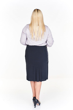 Estetycznie wyglądająca spódnica - połączenie satyny z tkaniną o nazwie „merino”. Na przodzie oryginalne cięcia, z prawej strony funkcjonalna kieszonka z pozłacaną ozdobą z 4 cyrkoniami. Na środku tyłu zakładki poszerzające dół spódnicy. Suwak kryty z boku. Jest podszewka. Spódnica w połączeniu z wizytową bluzką, tworzy świetny zestaw na służbowe spotkania lub ważne rodzinne uroczystości.