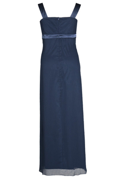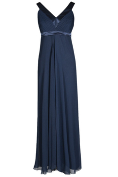 Długa, zwiewna, rozkloszowana sukienka. Połączenie szyfonu z satyną. Na karczku z przodu efektowne, delikatne plisowanie nieco dodające biustowi objętości. Dekolt przodu w kształcie serka, wysmuklający szyję. Z tyłu – w kształcie karo. Szerokie ramiączka. Odcięcie pod biustem podkreślone wąskim paskiem. Zapinana z tyłu na kryty suwak ułatwiający zakładanie. Sukienka maxi, doskonała na wesele, studniówkę i każdy inny uroczysty bal.