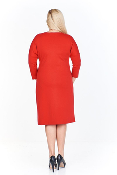 Prosta sukienka uszyta została z miłej w dotyku dzianiny. Dekolt okrągły. Na przodzie w okolicy pasa z lewej strony fantazyjnie upięte zakładki i broszka. Rękaw kimono o długości ¾. Tył prosty. Dół wykończony ściegiem krytym. Bez suwaka, bez podszewki. Sukienkę polecamy kobietom w każdym wieku, idealna na co dzień do pracy, jak również na uroczyste prywatne spotkania.
