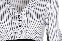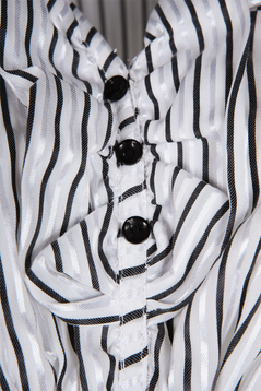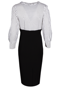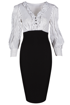 Prosta sukienka. Góra jest imitacją bluzki koszulowej. Dekolt serek, z przodu i z tyłu wykończony falbanką. Na środku 3 ozdobne guziki. Rękaw długości 3/4, na ramieniu marszczony, na dole szeroki makiet. W talii odcięcie, podkreślone paskiem. Dół prosty, dopasowany. Suwak kryty z boku. Z tyłu na dole rozporek zakładany, umożliwiający swobodne chodzenie. Dół sukienki został uszyty z tkaniny średniej grubości, delikatnie elastycznej, natomiast góra z cienkiej tkaniny bluzkowej. Sukieneczka idealna do pracy biurowej, na służbowe spotkania, lub na inne oficjalne wyjścia.