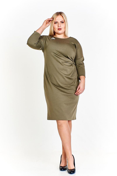 Prosta sukienka uszyta została z miłej w dotyku dzianiny. Dekolt okrągły. Na przodzie w okolicy pasa z lewej strony fantazyjnie upięte zakładki i broszka. Rękaw kimono o długości ¾. Tył prosty. Dół wykończony ściegiem krytym. Bez suwaka, bez podszewki. Sukienkę polecamy kobietom w każdym wieku, idealna na co dzień do pracy, jak również na uroczyste prywatne spotkania.