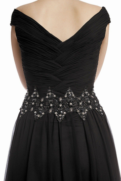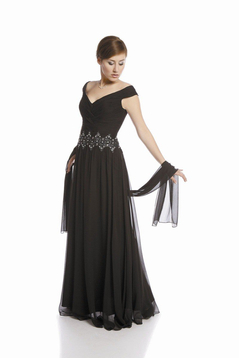 Zwiewna sukienka z szalem w zestawie. Długość maxi. Na przodzie efektowne aplikacje, w ich skład wchodzą koraliki, perełki, cekiny i wiele innych ozdób. Pod biustem oraz w tyłu znajduje się draperia. Na biuście zostały wszyte specjalne poduszki – miseczki mogące zastąpić biustonosz. Plecy częściowo odkryte. Sukienka jest luźna w biodrach. Doskonale tuszuje defekty kobiecej sylwetki. Sukienka idealna na uroczyste bale i przyjęcia, np. wesela, studniówki i wiele innych okazji.