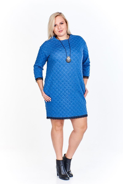 Prosta sukienka, nie ma zaznaczonej talii, jest w kształcie prostokąta. Doskonale tuszuje niedoskonałości sylwetki. Uszyta została z grubej, ciepłej dzianiny. Jest to pikówka z wytłaczanymi kółeczkami wykończona dodającą kobiecości koronką. Bez podszewki. Dekolt okrągły, podkreślony skórzana kokardką. Na biodrach funkcjonalne kieszenie. Rękawy długości 3/4. Sukienka codzienna, idealna na zimowe, chłodne dni. Została zaprojektowana z myślą o kobietach, w różnym wieku, chcącym wyglądać modnie i elegancko.