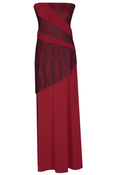 Długa, asymetryczna sukienka. Ramiona odkryte. Górna krawędź sukienki została wykończona gumą, co zapobiega samowolnemu zsuwaniu się z sylwetki. Przód fantazyjnie pocięty, ozdobiony koronką i  marszczeniami. Sukienka w biuście i pasie jest dopasowana, natomiast dół bardzo rozkloszowany. Uszyta z lejącej dzianiny, w połączeniu z czarną koronką. Bez podszewki. Bez suwaka. Sukienka idealna na uroczyste spotkania, np. wesela, studniówki i wiele innych okazji.