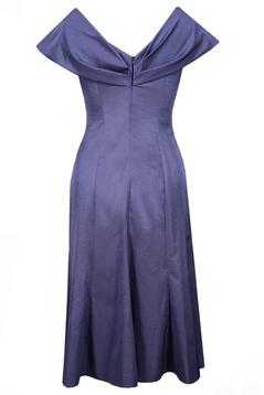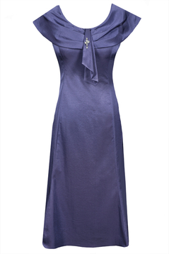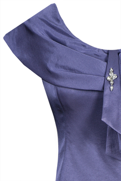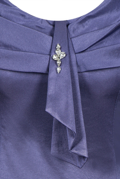 Sukienka wizytowa. Dekolt okrągły wykończony bardzo ozdobnym, opadającym na ramiona, szerokim kołnierzem. Na środku przodu, na kołnierzu znajdują się zakładki. Cięcia pionowe, dodają sylwetce lekkości. Dół poszerzany. Suwak kryty z tyłu. Jest podszewka, ale kończy się w okolicy pasa. Sukienka została uszyta z tkaniny lekko elastycznej, z delikatnym połyskiem. Sukienkę polecamy kobietom dojrzałym, na ważne uroczystości, np. wesela, komunie i wiele innych okazji.