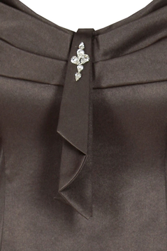 Sukienka wizytowa. Dekolt okrągły wykończony bardzo ozdobnym, opadającym na ramiona, szerokim kołnierzem. Na środku przodu, na kołnierzu znajdują się zakładki. Cięcia pionowe, dodają sylwetce lekkości. Dół poszerzany. Suwak kryty z tyłu. Jest podszewka, ale kończy się w okolicy pasa. Sukienka została uszyta z tkaniny lekko elastycznej, z delikatnym połyskiem. Sukienkę polecamy kobietom dojrzałym, na ważne uroczystości, np. wesela, komunie i wiele innych okazji.