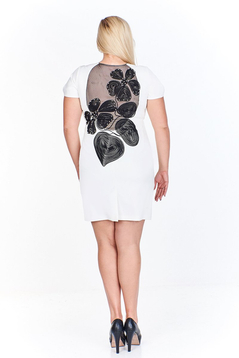 Dekolt okrągły, podkreślony wypustką. Rękaw krótki z niewielką kontrafałdą na środku. Z przodu cięcia francuskie modelujące biust oraz talię. Oryginalnie haftowane plecy, nadają wieczorowego charakteru. W rozmiarach 38-42 pod haftem jest jedynie przeźroczysty czarny tiul, w większych rozmiarach natomiast dodatkowo została podszyta podszewka w cielistym kolorze. Z tyłu na dole rozporek umożliwiający swobodne chodzenie. Suwak kryty z boku. Podszewka elastyczna. Sukienka idealna na wesele, studniówkę lub inne uroczyste spotkania. Sukieneczkę polecamy głównie młodym, odważnym dziewczynom, lubiącym wyglądać nietuzinkowo i elegancko.