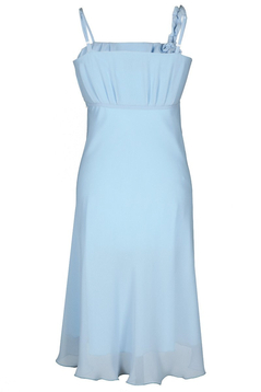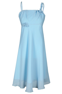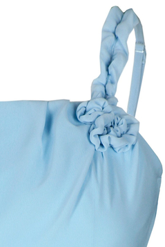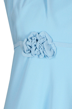 Sukienka empire. Pod biustem odcięta, dołem poszerzana. Sukienka o bardzo wdzięcznej linii trapezu. Ramiączka regulowanej długości. Góra sukienki delikatnie zaokrąglona. Na biuście efektowne zakładki, oraz ręcznie układane marszczenia, tworzące zarys kwiatów. Kwiatki zostały zrobione z tej samej tkaniny co sukienka, więc ich kolor jest identyczny. Odcięcie pod biustem zostało podkreślone wąską wypustką. Dół jest szeroki, bardzo efektownie się prezentuje, zwłaszcza podczas tańca. Z boku suwak kryty. Materiał wykorzystany do produkcji to miękki szyfon. Jest podszewka. Sukieneczka została zaprojektowana z myślą o młodych dziewczynach. Można ją założyć na wesele lub studniówkę oraz na wiele innych okazji.