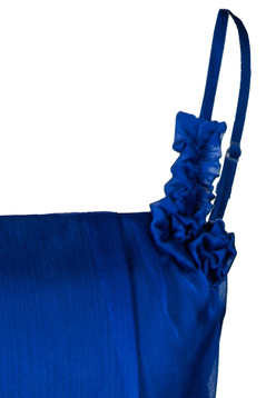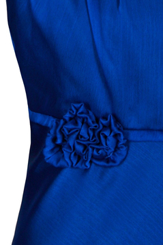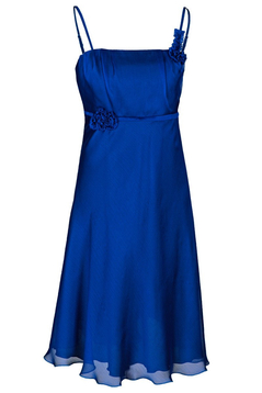 Sukienka empire. Pod biustem odcięta, dołem poszerzana. Sukienka o bardzo wdzięcznej linii trapezu. Ramiączka regulowanej długości. Góra sukienki delikatnie zaokrąglona. Na biuście efektowne zakładki, oraz ręcznie układane marszczenia, tworzące zarys kwiatów. Kwiatki zostały zrobione z tej samej tkaniny co sukienka, więc ich kolor jest identyczny. Odcięcie pod biustem zostało podkreślone wąską wypustką. Dół jest szeroki, bardzo efektownie się prezentuje, zwłaszcza podczas tańca. Z boku suwak kryty. Materiał wykorzystany do produkcji to miękki szyfon. Jest podszewka. Sukieneczka została zaprojektowana z myślą o młodych dziewczynach. Można ją założyć na wesele lub studniówkę oraz na wiele innych okazji.