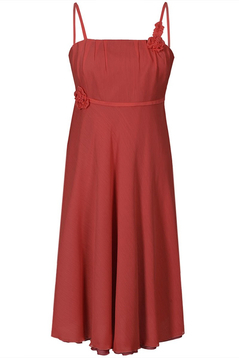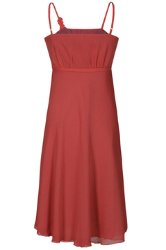 Sukienka empire. Pod biustem odcięta, dołem poszerzana. Sukienka o bardzo wdzięcznej linii trapezu. Ramiączka regulowanej długości. Góra sukienki delikatnie zaokrąglona. Na biuście efektowne zakładki, oraz ręcznie układane marszczenia, tworzące zarys kwiatów. Kwiatki zostały zrobione z tej samej tkaniny co sukienka, więc ich kolor jest identyczny. Odcięcie pod biustem zostało podkreślone wąską wypustką. Dół jest szeroki, bardzo efektownie się prezentuje, zwłaszcza podczas tańca. Z boku suwak kryty. Materiał wykorzystany do produkcji to miękki szyfon. Jest podszewka. Sukieneczka została zaprojektowana z myślą o młodych dziewczynach. Można ją założyć na wesele lub studniówkę oraz na wiele innych okazji.
