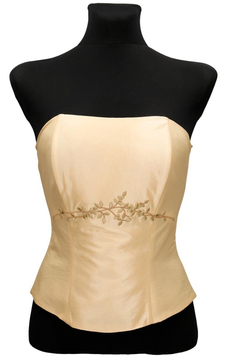 Gorset z fiszbinami wiązany z tyłu, Gorsetem podkreślisz piękne ramiona i uwydatnisz biust, wiązaniem z tyłu dobrze go dopasujesz. Materiał - połyskująca tafta z kwiatowym haftem. Dopasowana góra, podkreślona talia to klasa i styl. Gorset uzupełni twoją garderobę, można nosić go zarówno do spodni jak i spódnic. Idealny dla pań, które lubią podkreślić swoją sylwetkę.