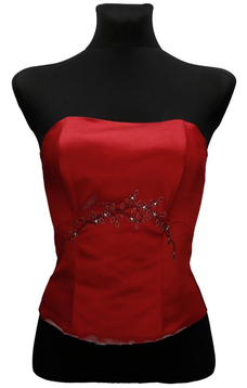 Gorset z fiszbinami wiązany z tyłu, Gorsetem podkreślisz piękne ramiona i uwydatnisz biust, wiązaniem z tyłu dobrze go dopasujesz. Materiał - połyskująca tafta z kwiatowym haftem. Dopasowana góra, podkreślona talia to klasa i styl. Gorset uzupełni twoją garderobę, można nosić go zarówno do spodni jak i spódnic.